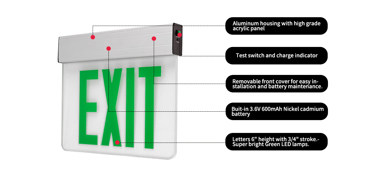 *Ľahká inštalácia v minútach - výstupná značka osvetlených okrajov je vhodná pre stenu, sklonené, vysoké alebo štandardné stropné montáž. Zahŕňa inštalovateľné smerové ukazovatele šípky na inštaláciu poľa. Zahrnutý je všetok hardvér.