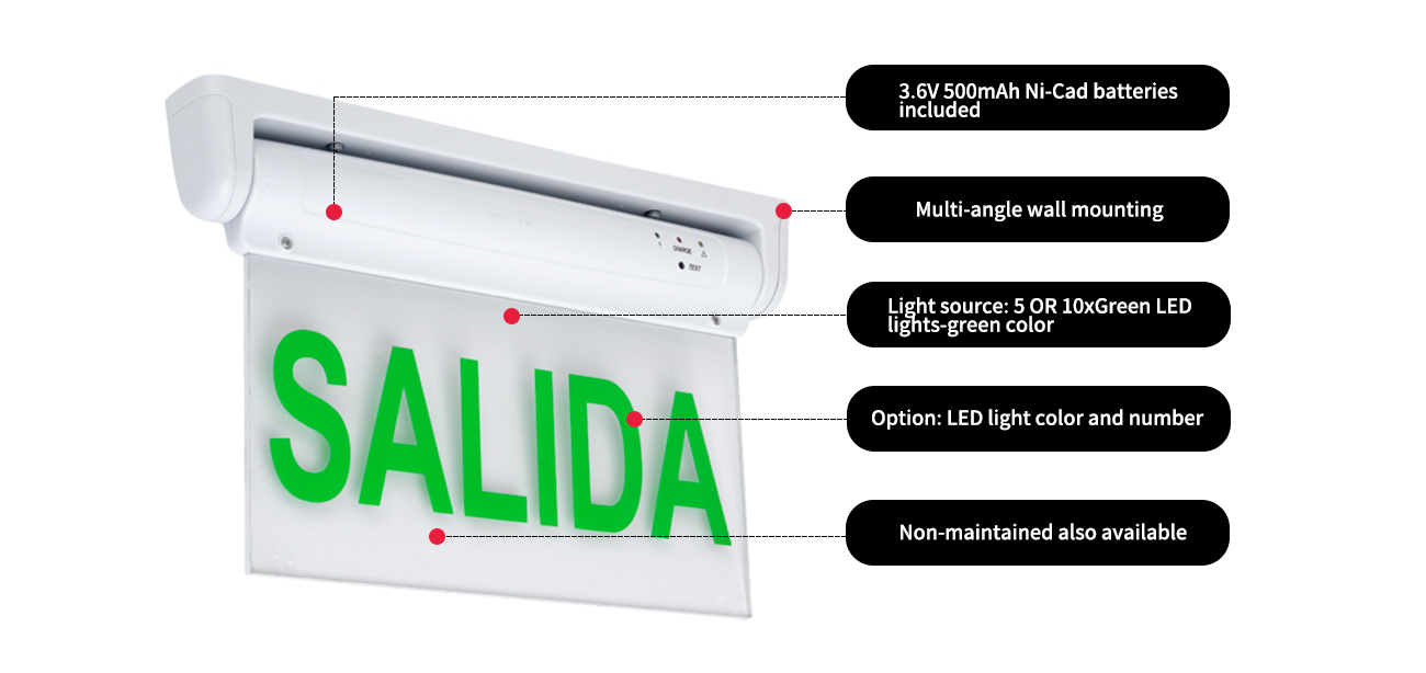 *Zálohovanie batérie núdzového napájania-Výstupná značka LED je navrhnutá s batériou NI-CAD s 500 mAh bez údržby, ktorá poskytuje minimálne núdzové trvanie 6 hodín. Čas nabíjania batérie je 24 hodín.